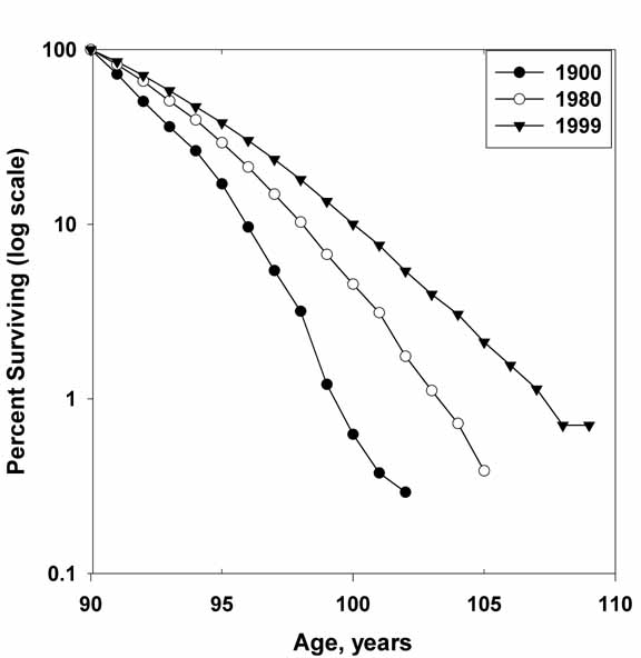 (cross-sectional data). Note that after age 100, the logarithm of